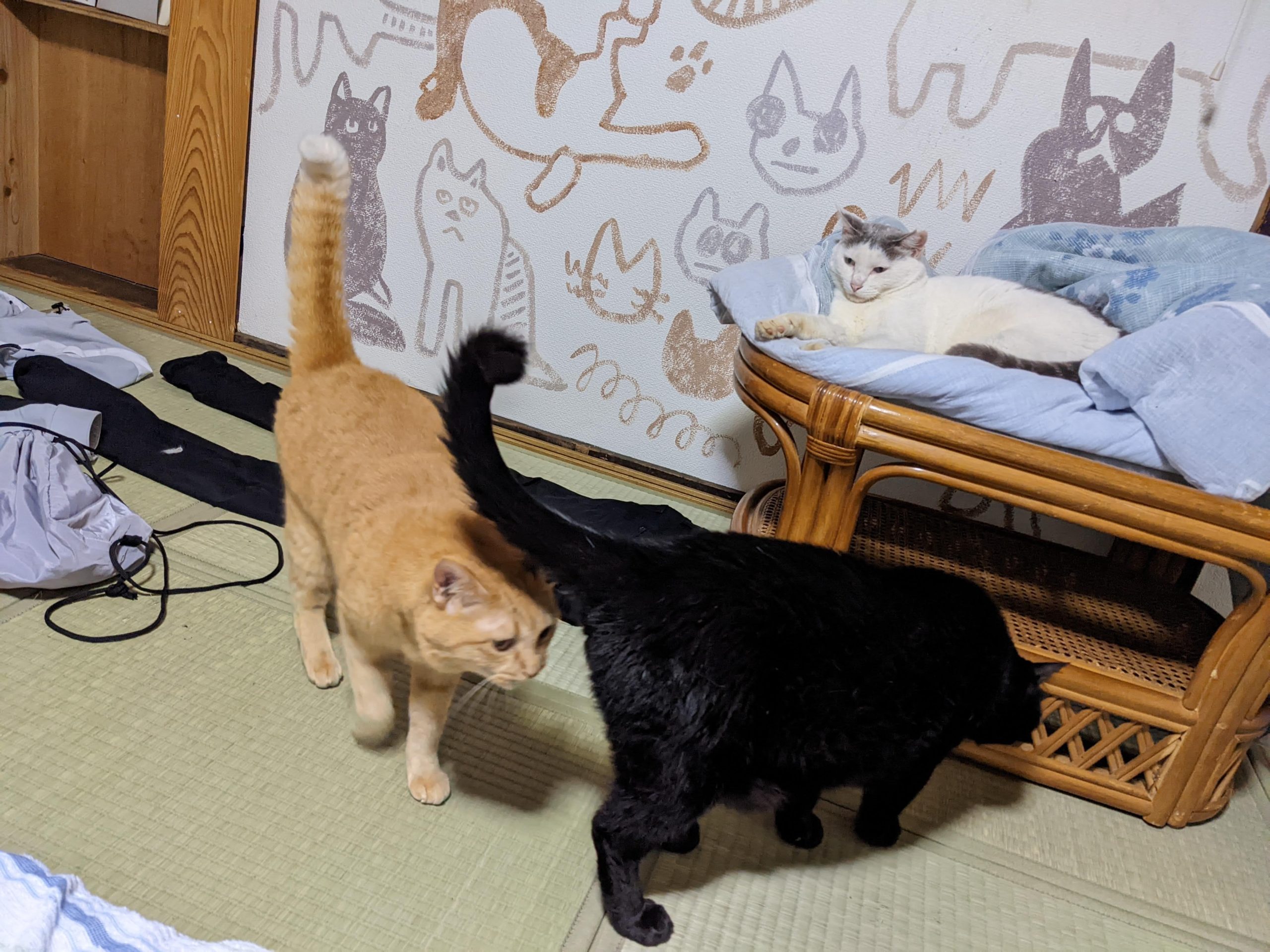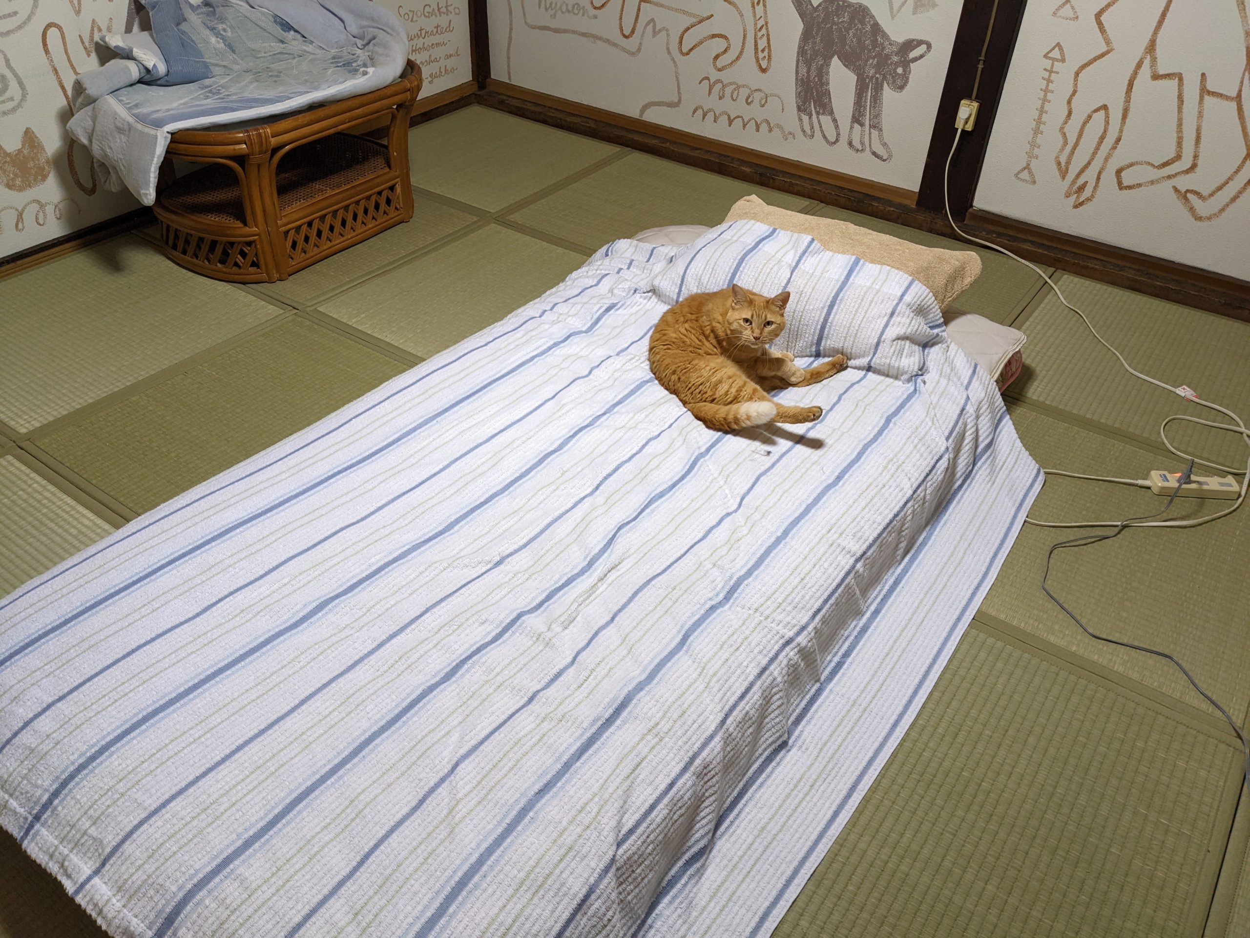 その後、寝室を案内されましたが、布団の上には先客がいました。こごみちゃんという猫でしたね。
