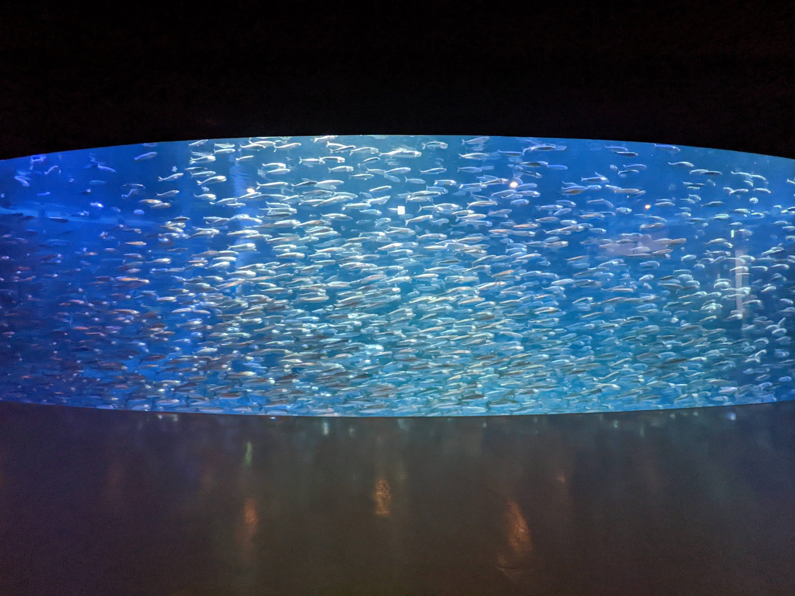 ばかでかい円柱の水槽にイワシだけがいます。圧巻。