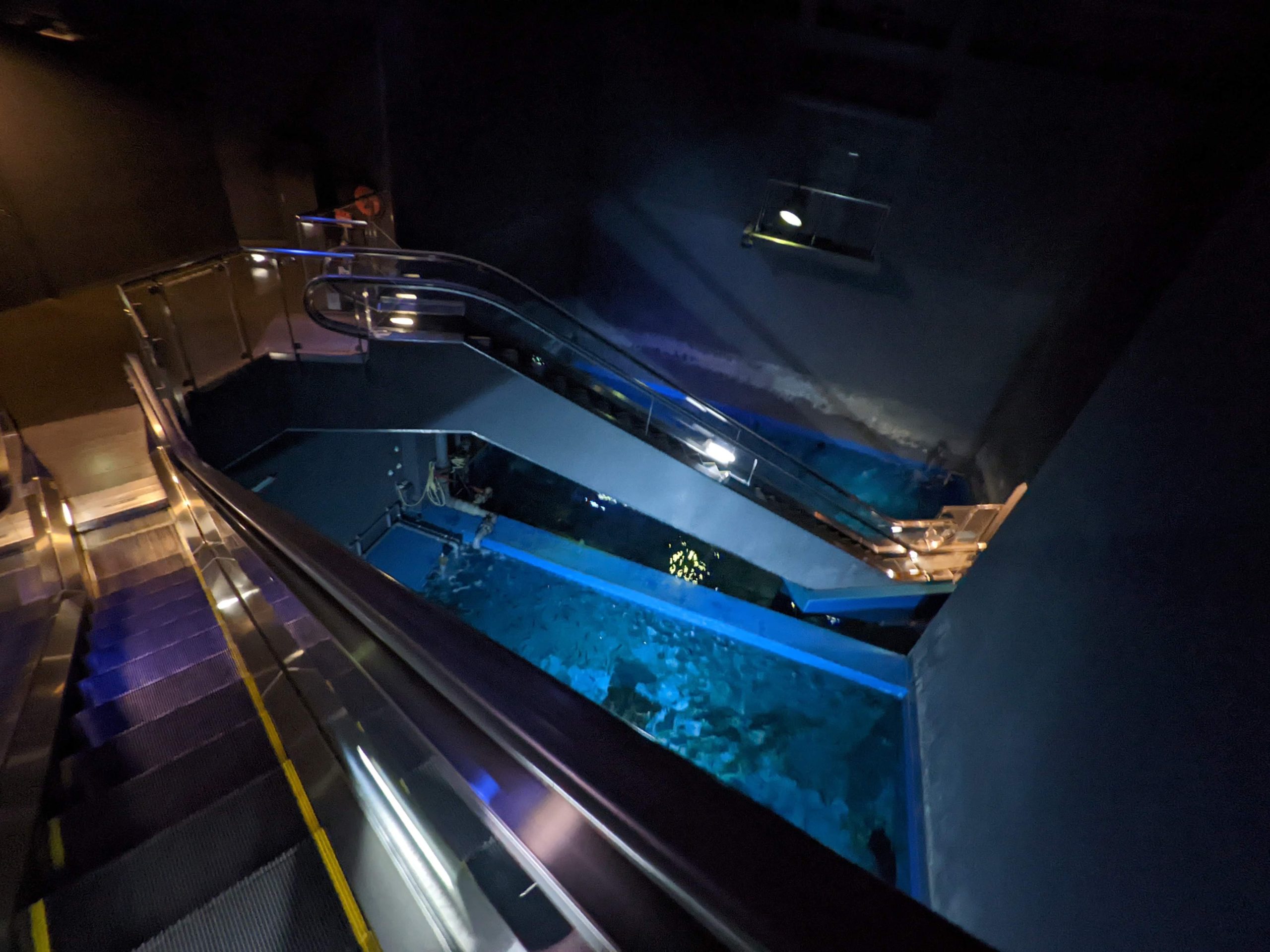 このお城の中が全部水族館です。わーお。最初にエスカレーターにのって最上階に行き、下っていくという順路なんですが、エスカレーターがやばすぎます。一階にあるトンネルの水槽の上をエスカレーターが通っているのですが、下を覗き込むのが怖くなるくらい、よく魚が見えます。サメもいます。誰か過去に子どもとか落ちてるんじゃないかと心配になるくらいです。少なくとも何か物を落とした人はいるはず……。すごい。