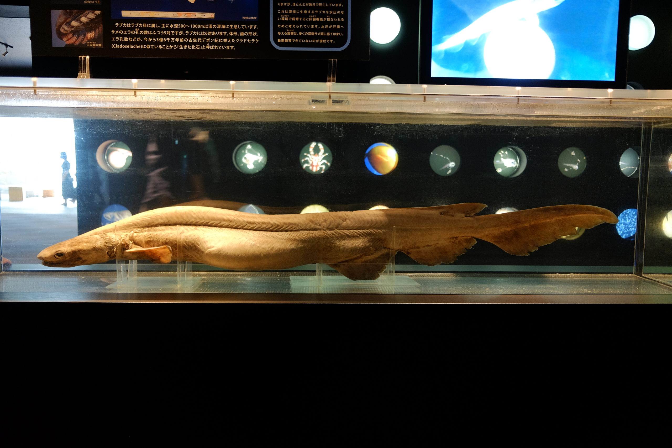 サメ、結構好きなんですが、ラブカの展示があります。ラブカは深海魚なんで水族館の展示には耐えられず死んでしまうんですが、卵を孵したりとかしているようで研究されているみたいです。
