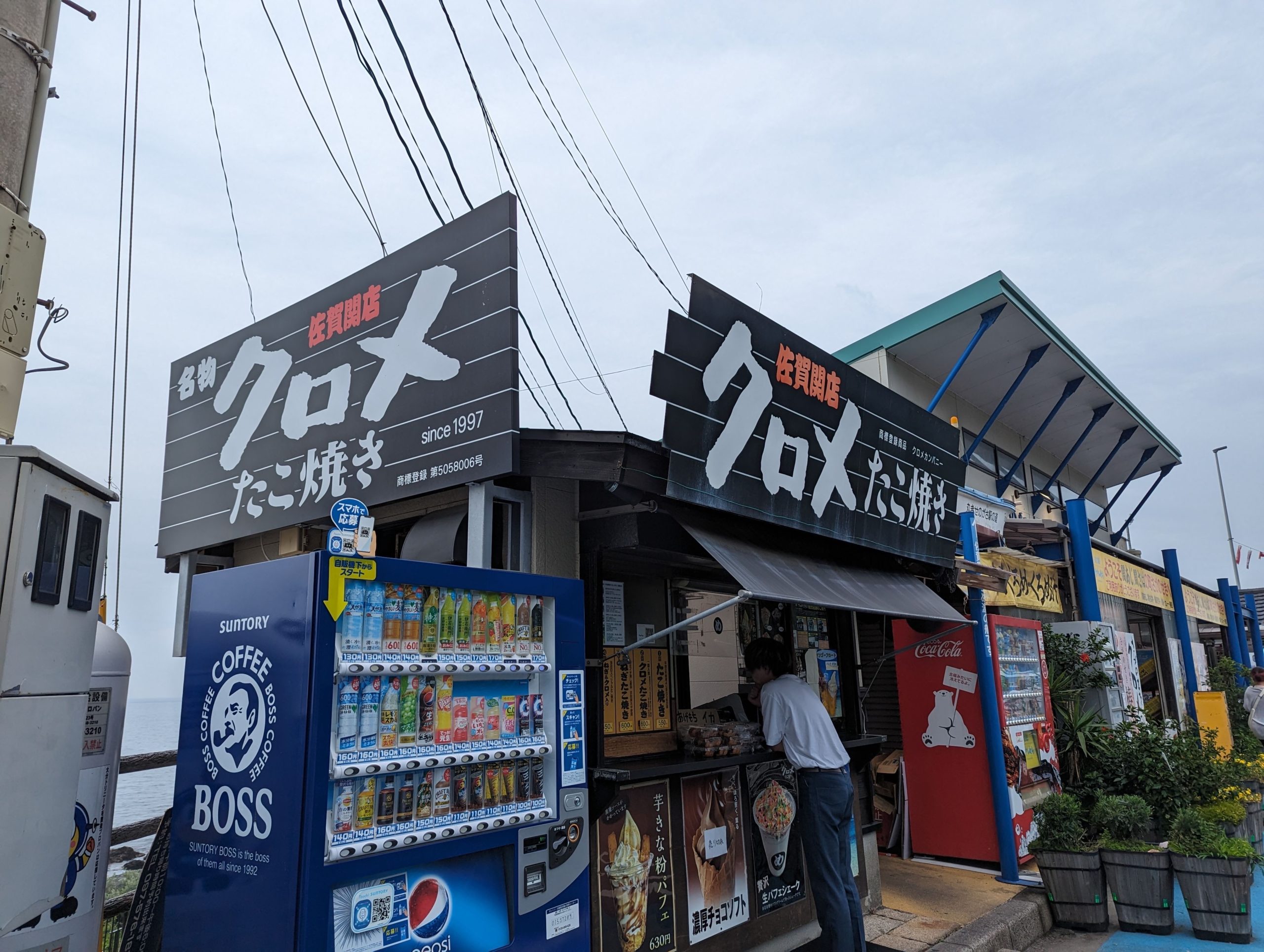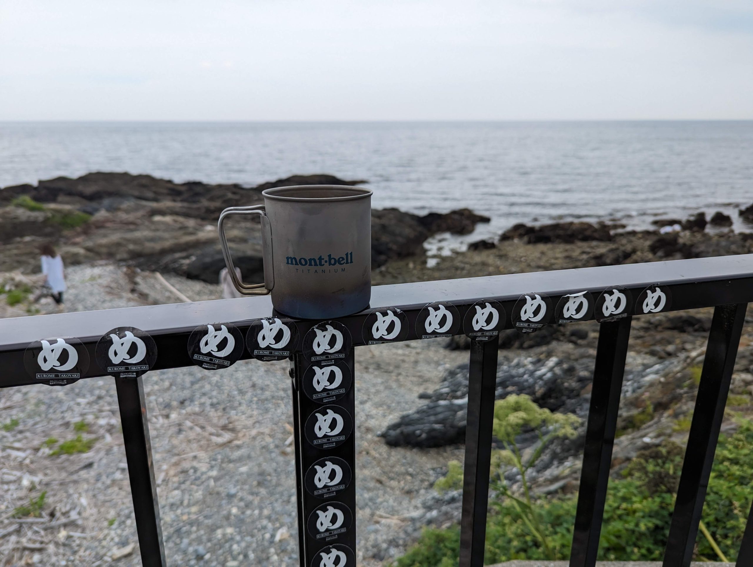 クロメっていう海藻?のたこ焼きが有名なんですが今回は時間なくて食べずに海見ながらコーヒー飲んでたんですが、よく見たら柵にたくさんの「め」のシールが。おそらくこのたこ焼きを買うとついてくるシールをみんなで貼ってるんでしょうね。神社のおみくじみたいになってる。