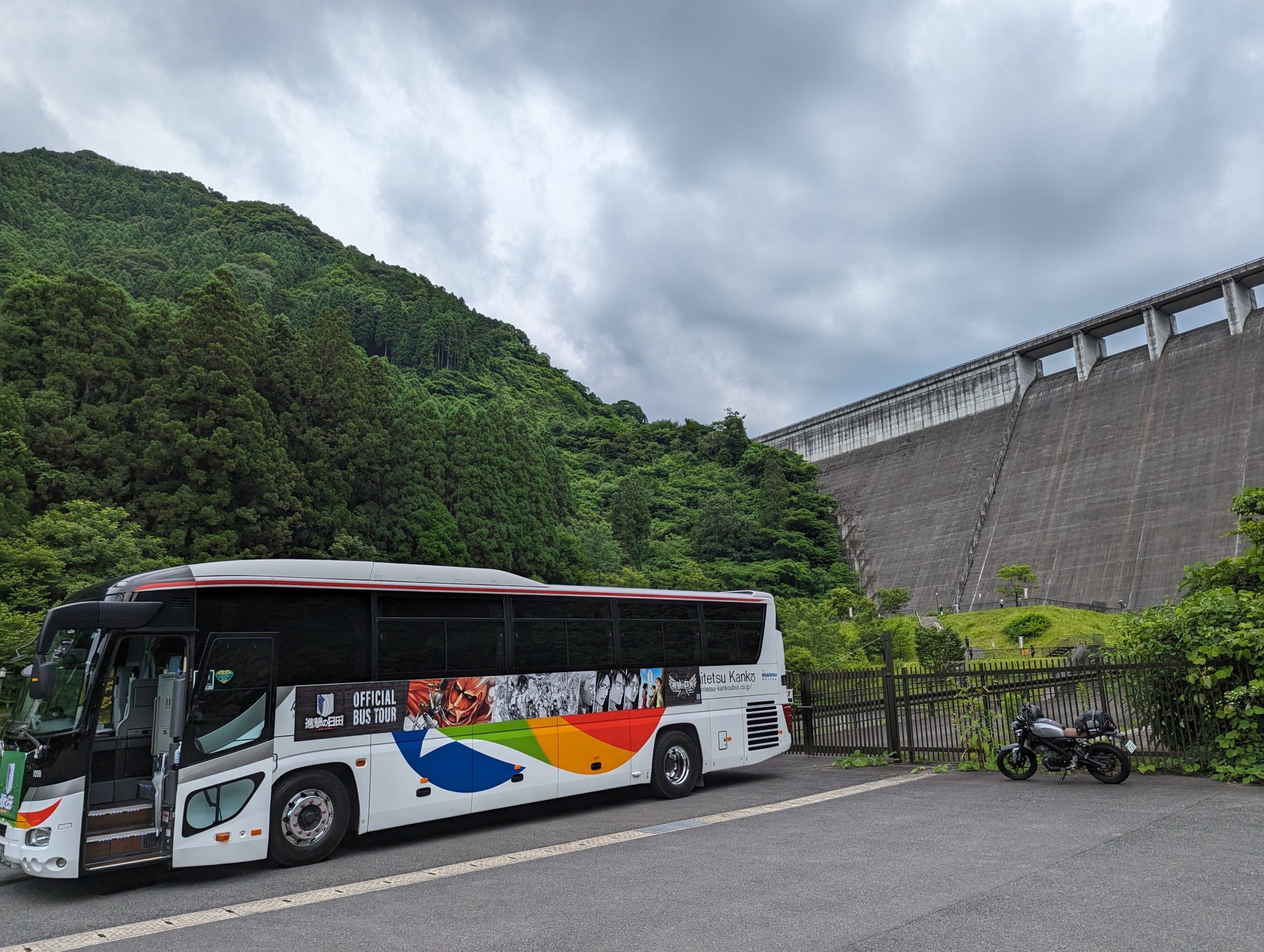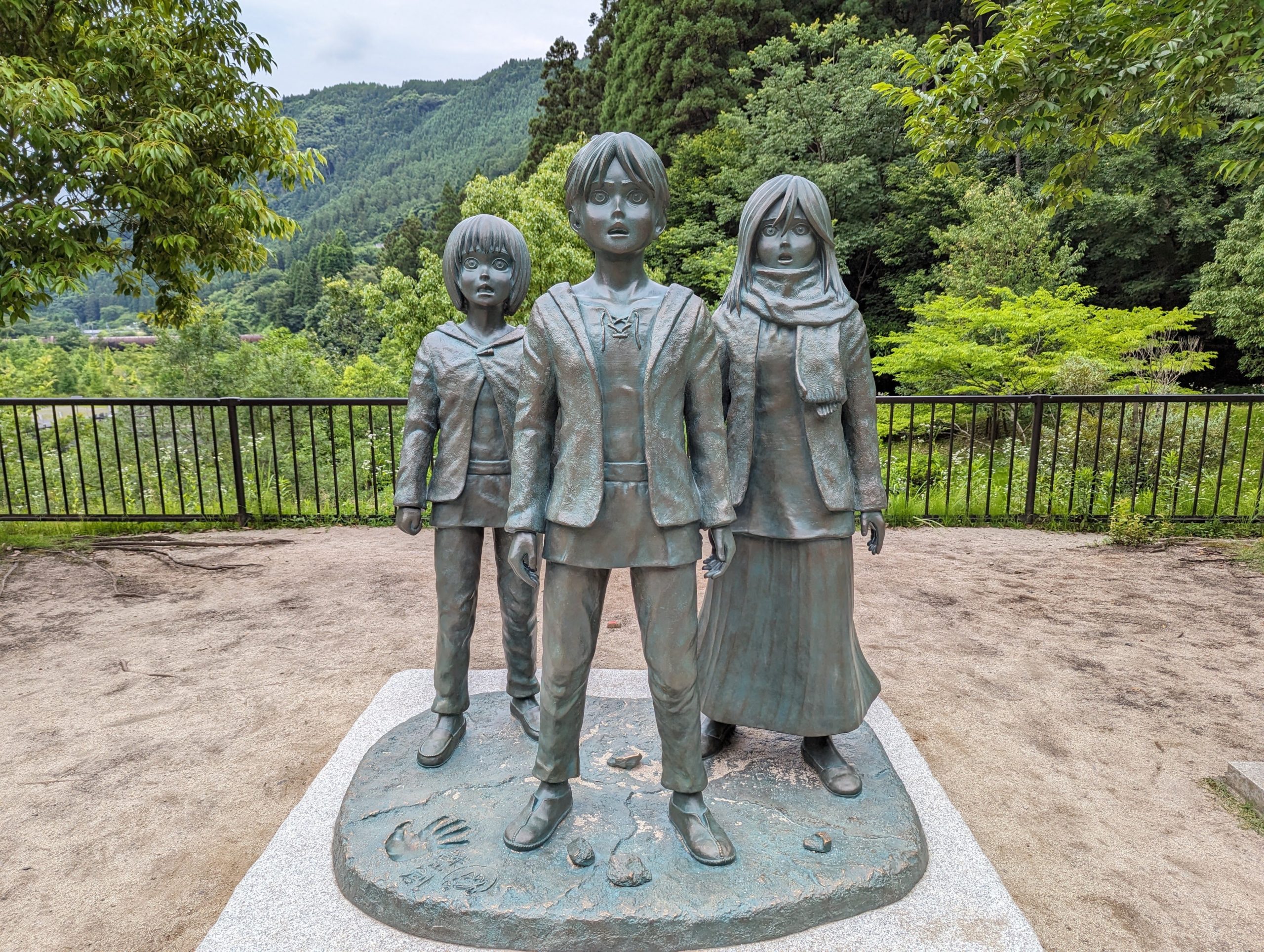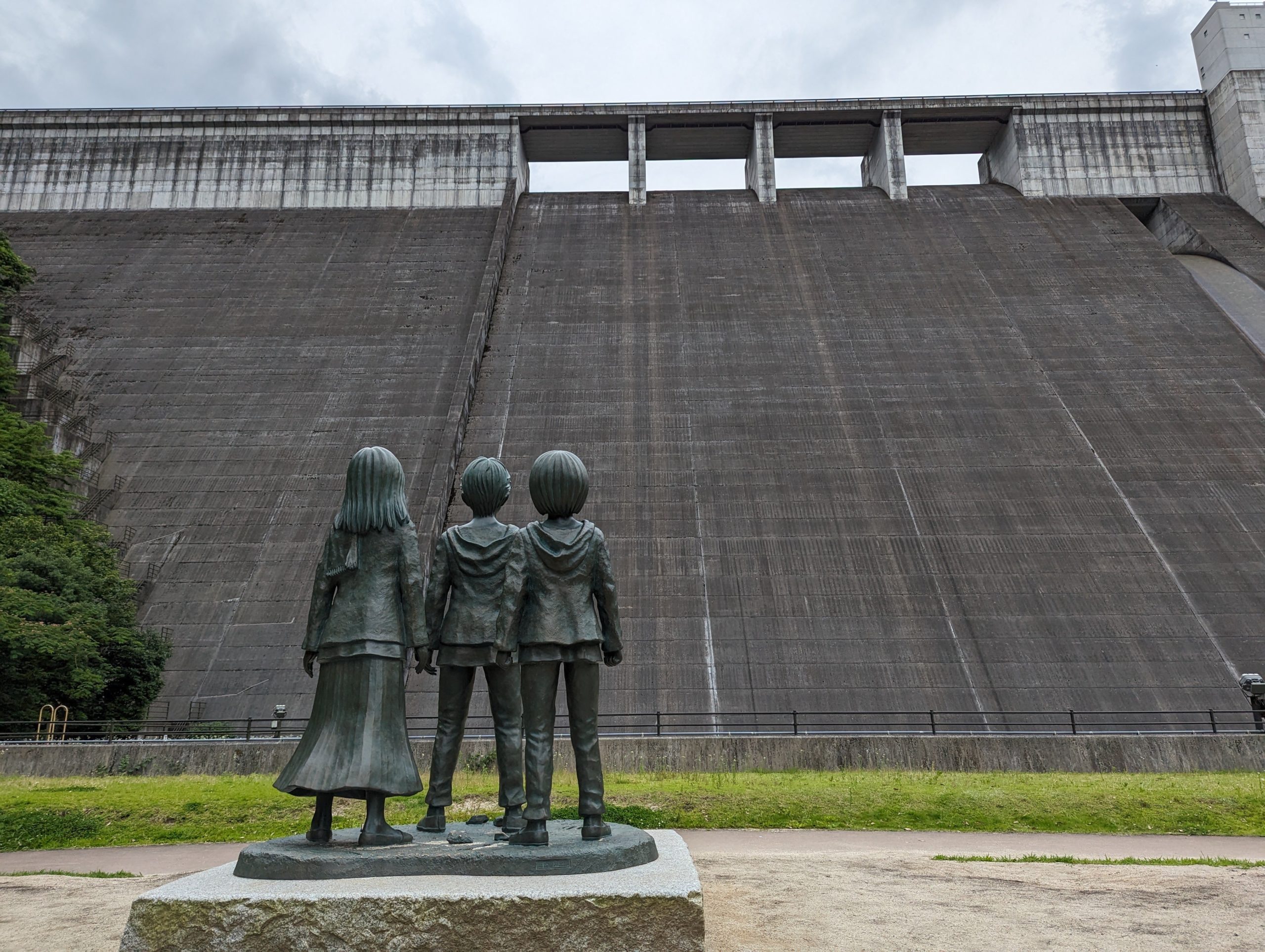 大山ダムをナビに入れるとダムの上まで連れて行かれるのでその手前の看板を見て脇道にそれるとエレンたちの銅像のところに行けます。ダムを進撃の巨人の壁に見立てるのはいい発想だなと思います。