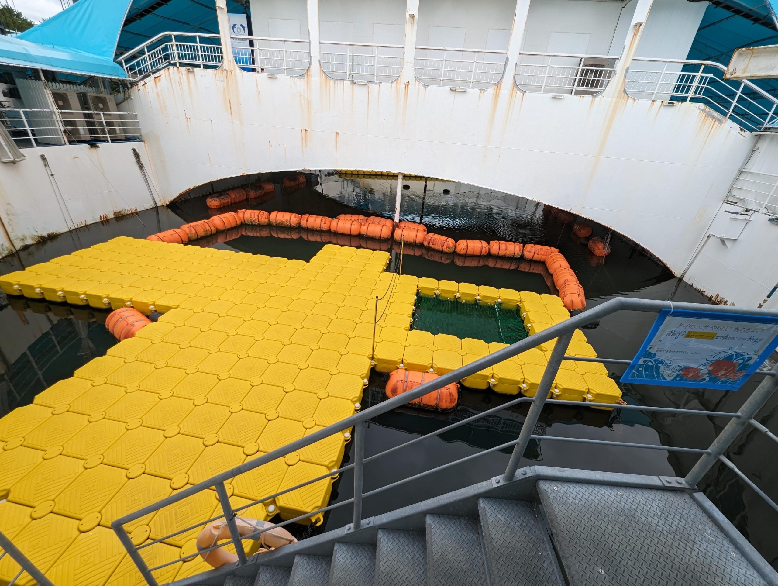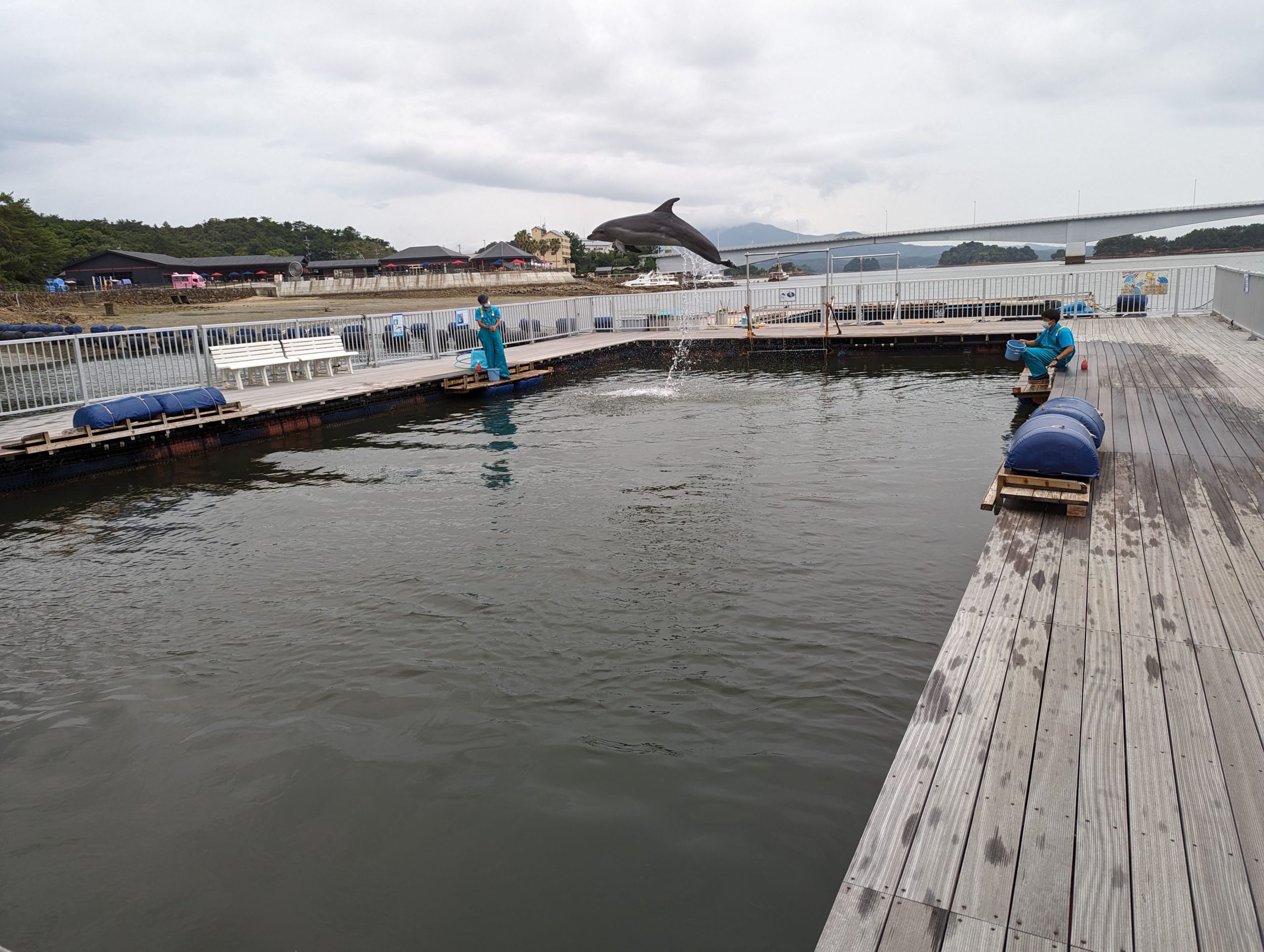 イルカとのふれあいがおしみたいですが、今日は時間をすぎててできませんでした。が、イルカ生簀で飼育員さんがトレーニングしててジャンプしたりする姿は見れました。かなり至近距離で見られるのいいですね。ジャンプすると生簀がゆらゆら揺れて楽しいです。