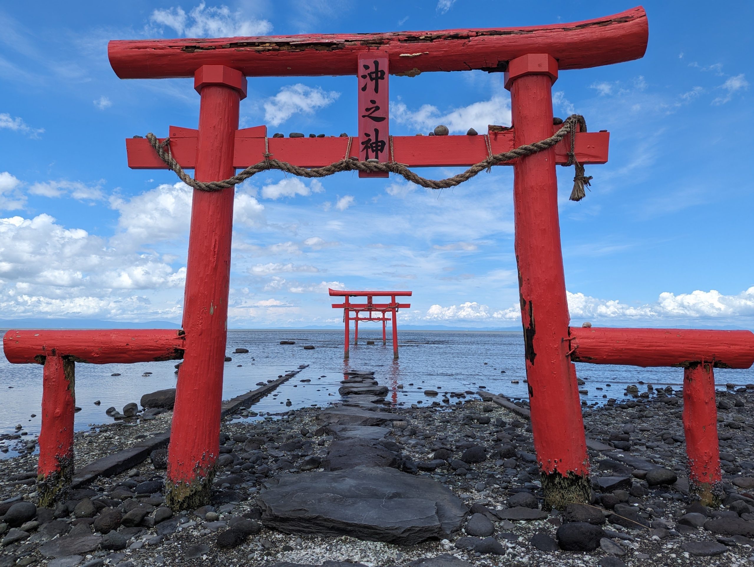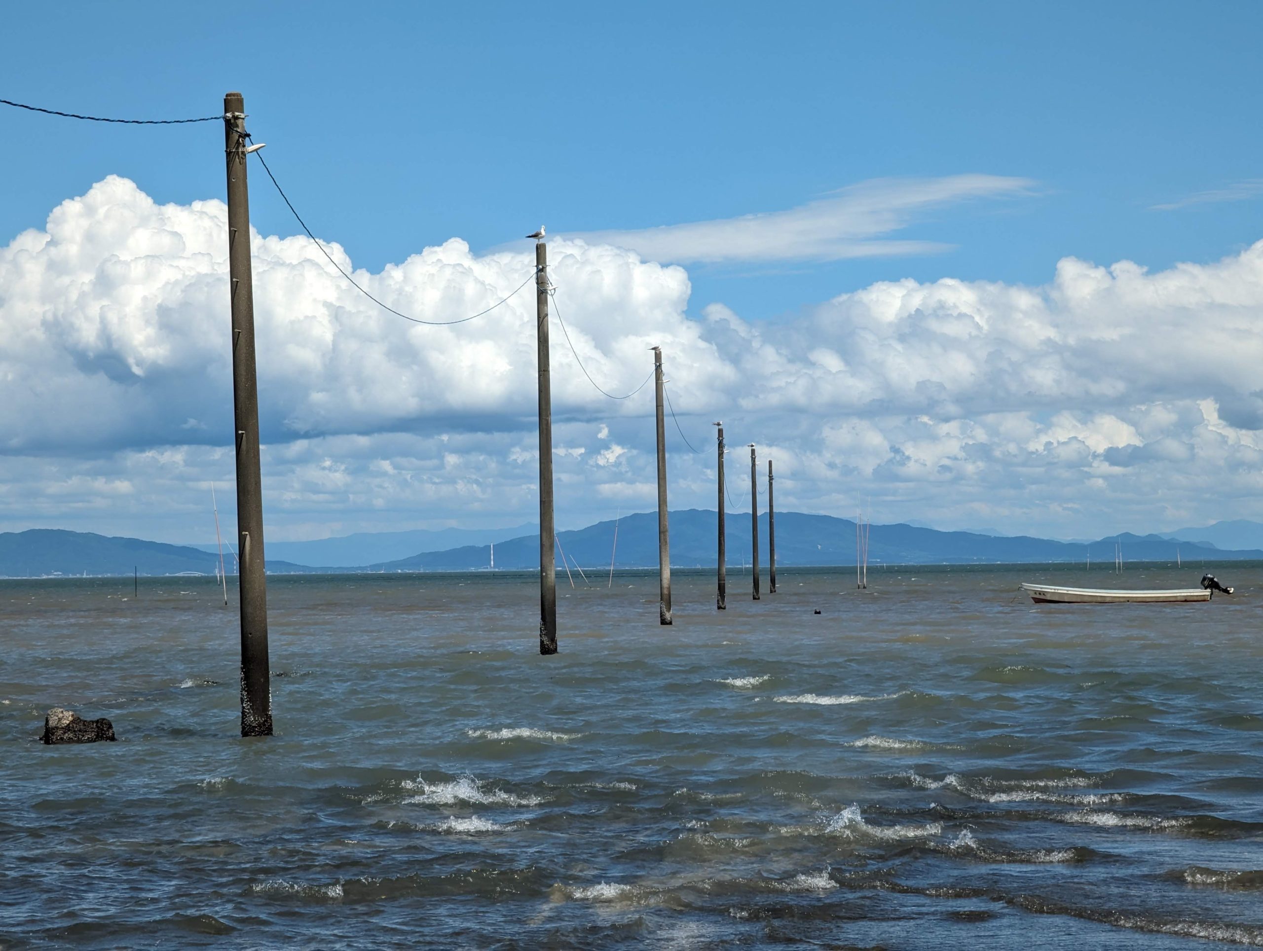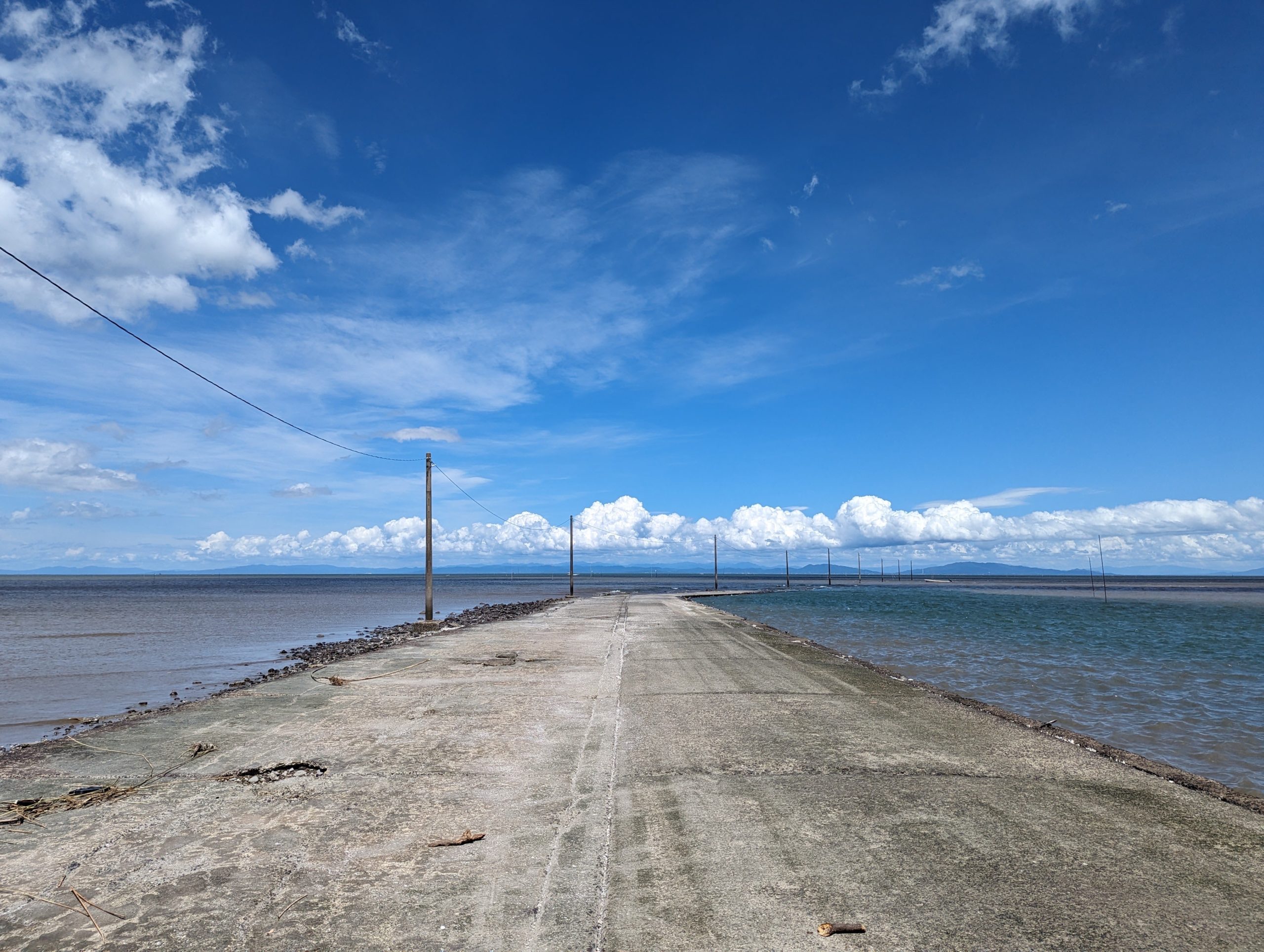 雲仙多良シーラインという、有明海をつっきった道路を渡って佐賀にはいってすぐのところにある映えスポットです。熊本のゲストハウスにいるときに教えてもらいました。海中に鳥居が三つと奥には電柱が海水につかった道があります。