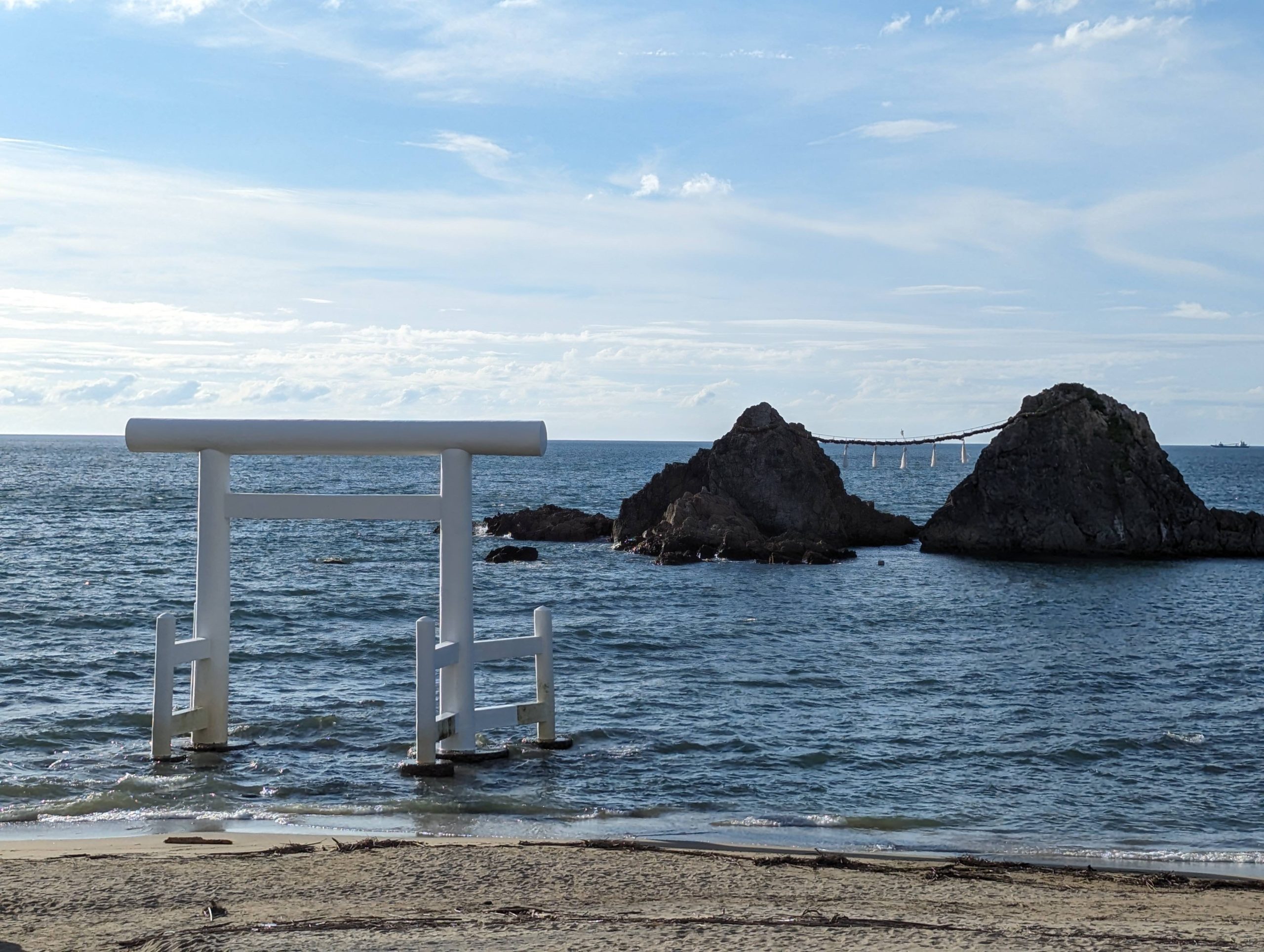 桜井二見ヶ浦 夫婦岩という白い鳥居のあるところは映えスポットらしくたくさんの人が写真撮ってたので自分は斜めからズームして撮りました笑